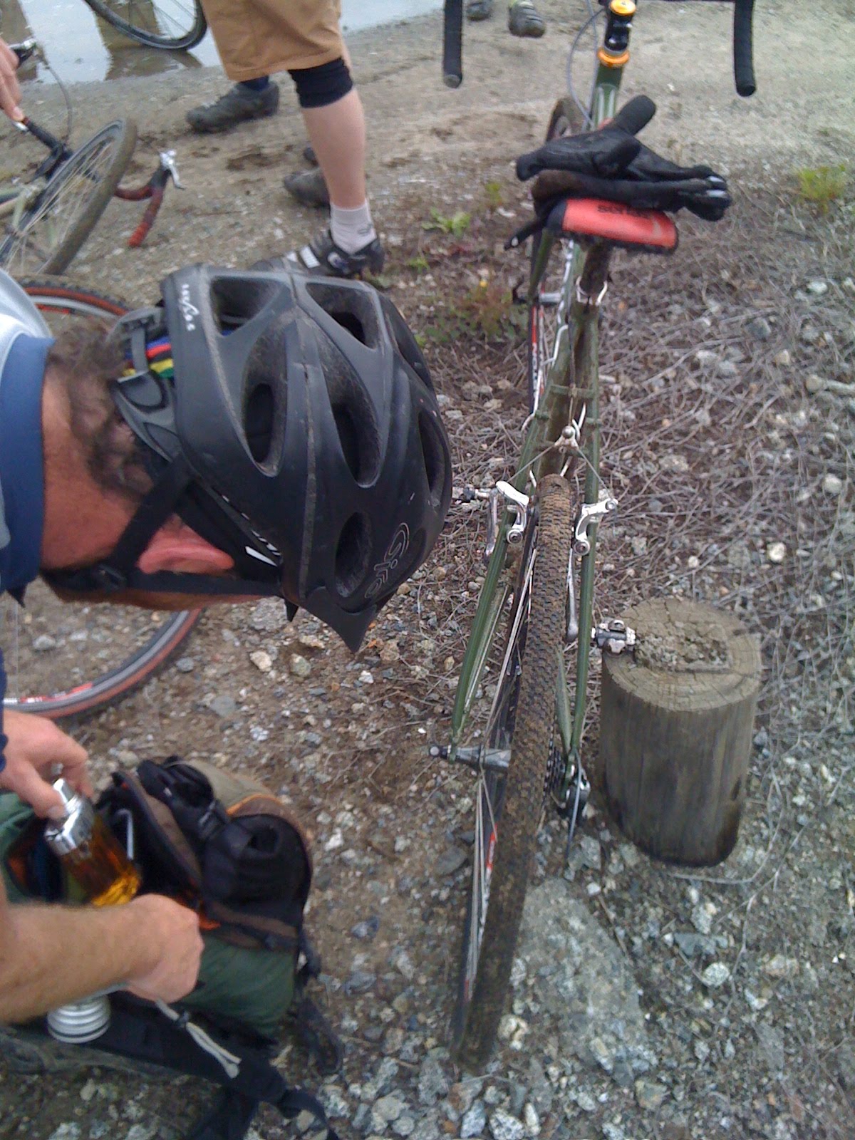 Flat stops. Ok, so all these were from the same flat stop, because I got tired of pulling the phone out to "document" flats. Several people had multiple punctures per wheel at this stop, which was immediately following the bad idea to ride cross bikes on railroad tracks. You'd think it was the sharp ballast stones that gave the flats, and you'd be right. But you'd be righter still if you thought it was the thorn filled exit from those tracks that really did the trick. It soon became ridiculous. We tried to roll out several times, only to have another cry of "Flat!"